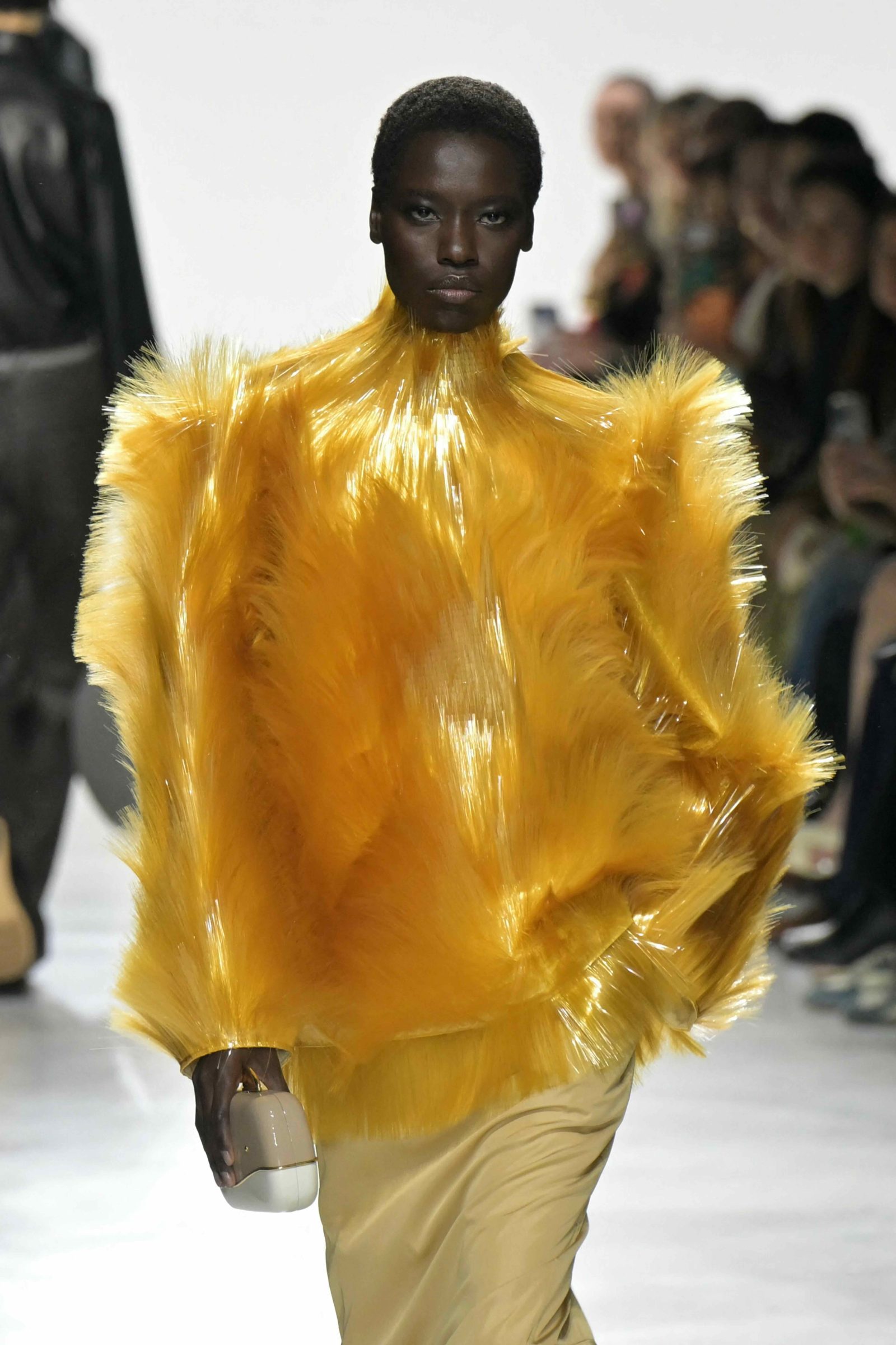 Louise Trotter’s debut at Bottega Veneta marked both a personal milestone and a celebration of the brand’s craftsmanship. She reimagined the intrecciato in new forms: a tailored coat resembling snakeskin, a feather-light robe coat, and a floor-length cape of superfine leather strips.