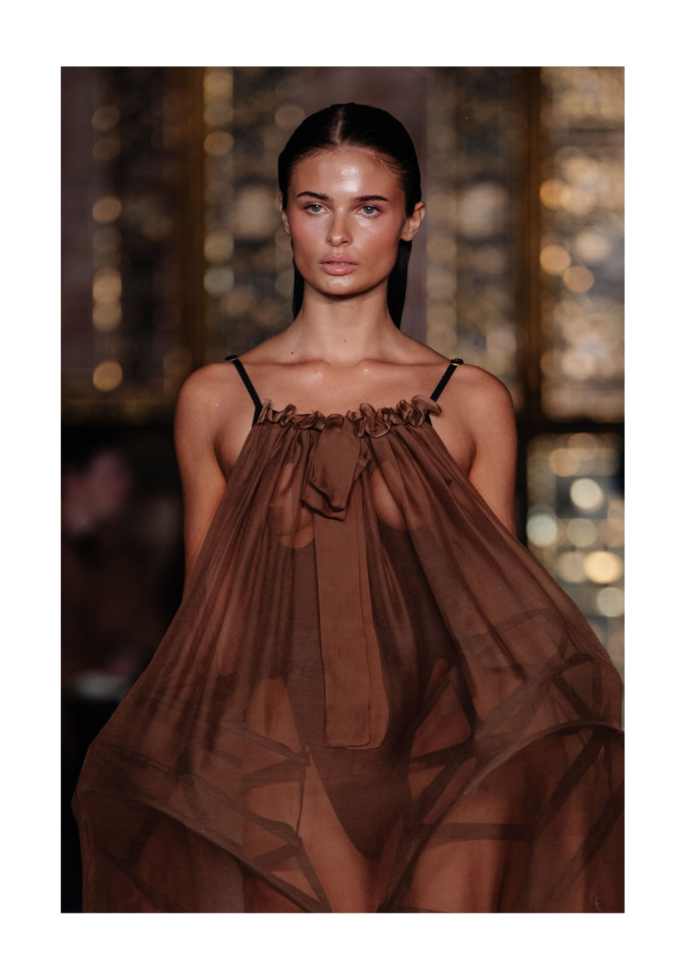 Geometric cut-outs, elongated capes, and hosiery-inspired layering created a dialogue between fragility and strength, where minimal coverage translated into an effortless sense of modern sensuality.
