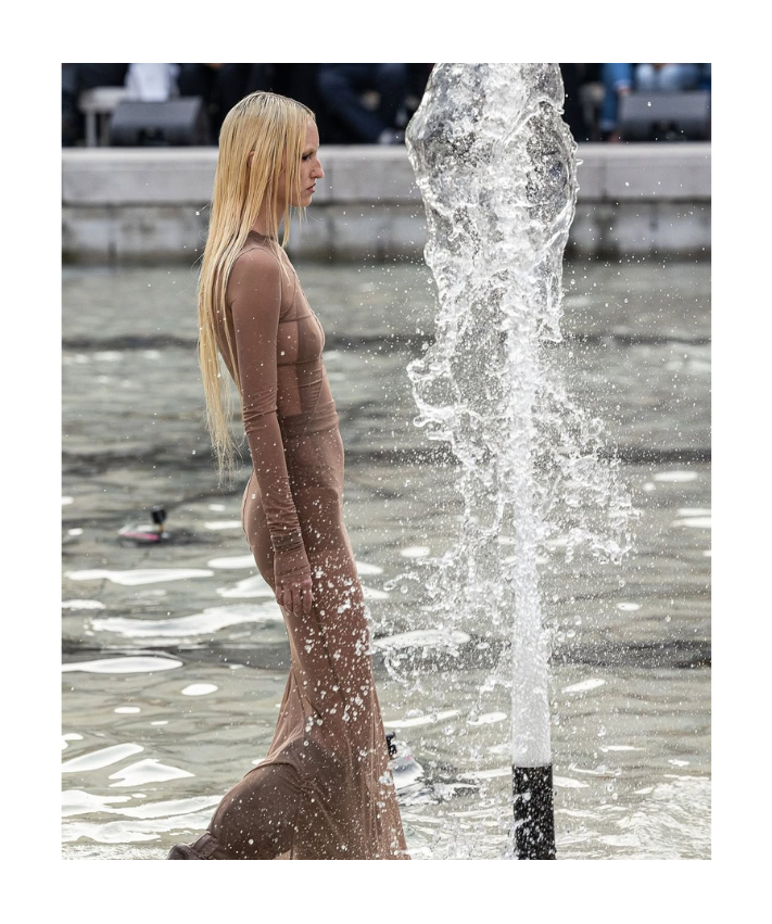 Rick Owens transformed the Palais de Tokyo into a stage of defiance and reflection for his Spring/Summer 2026 collection. Models emerged through the fountain, eyes veiled by black contact lenses, their presence spectral, almost prophetic.