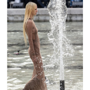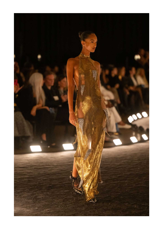 Tailored skirt suits exposed padding as structure, ribbed knits and asymmetric pencil skirts twisted expectations, while bias-cut dresses with intentional “rips” recalled Schiaparelli and Dalí’s 1938 collaboration, rendered this time in jersey, crystal mesh, and metal.