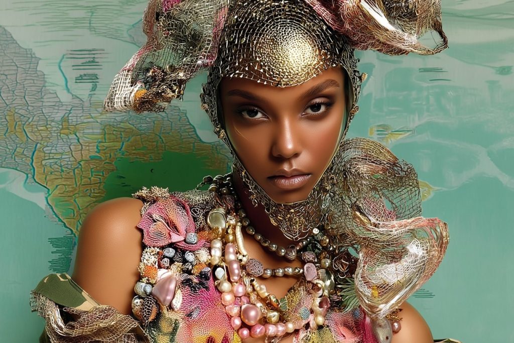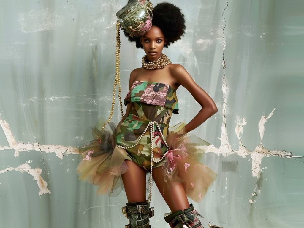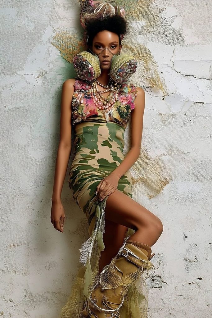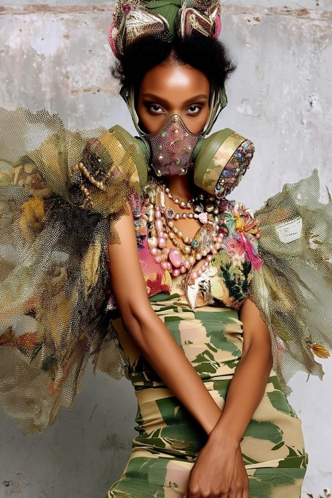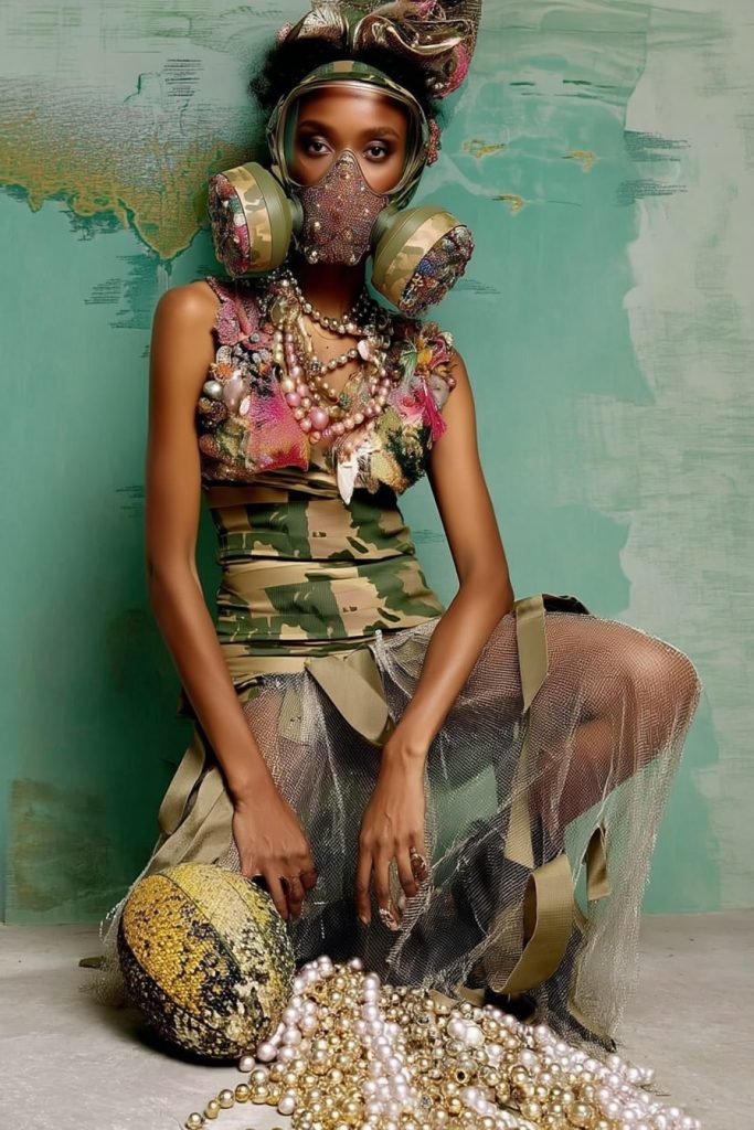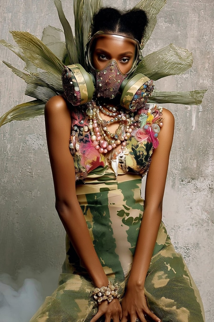 The body as resistance. Beads, carbon, and camouflage fuse into a language of survival and spectacle ; Image Source : AI-Generated by Gazetta