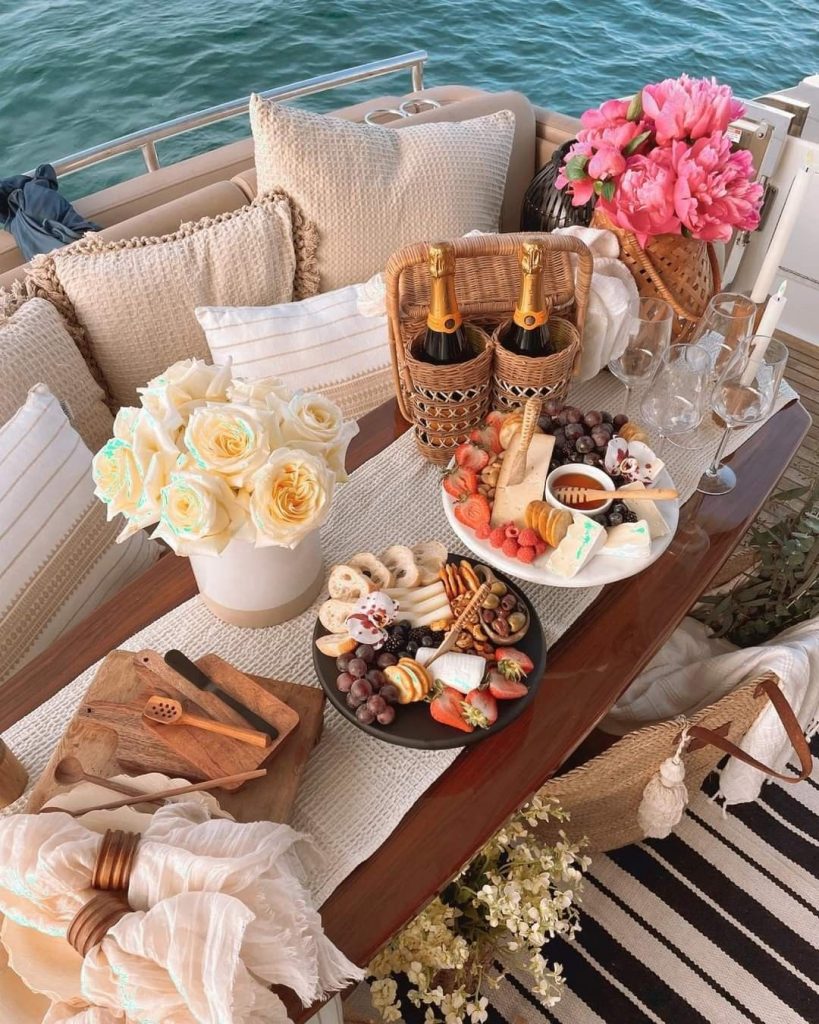 That same restraint carries through to the table. The most compelling deck tables now feel styled, not set. White on white linens with subtle texture form the base, allowing place settings, glassware, and the surrounding sea to do the rest of the work. It is a look that feels effortless but is anything but accidental. Spacing matters. Folds matter. Even what is visible or intentionally hidden on the plate becomes part of the composition. Colour, when introduced, is used sparingly, a navy edge, a sand toned thread, a single accent pulled from the coastline rather than the yacht club.
