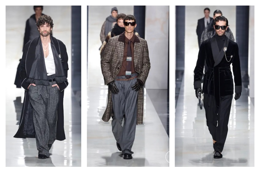 The staging felt disjointed, shifting abruptly from gentlemanly elegance to theatrical dandyism, luxury shearling, leopard loungewear, military coats, and sporty references.