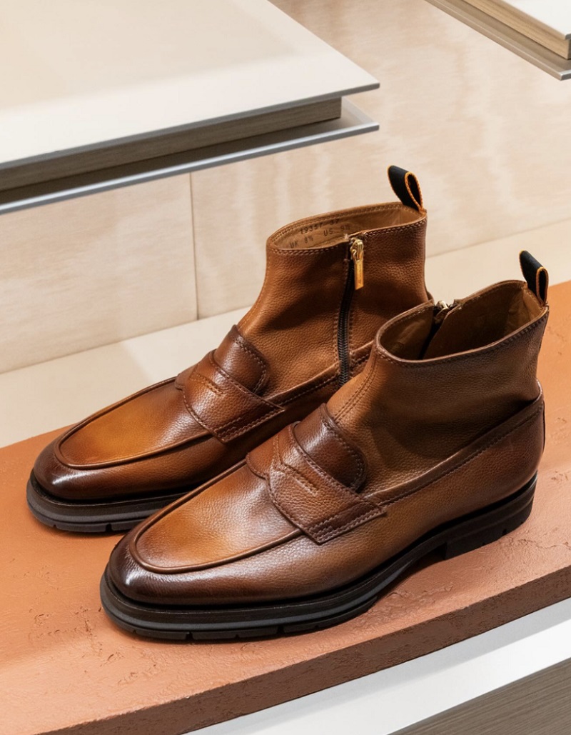 Santoni redefined its signature velatura patina through a rugged, alpine-inflected lens. The standout Karl Ice boot introduced technical innovation with a reversible Cervino sole engineered for icy terrain, while refined hybrids blurred the line between loafer and mountain boot.