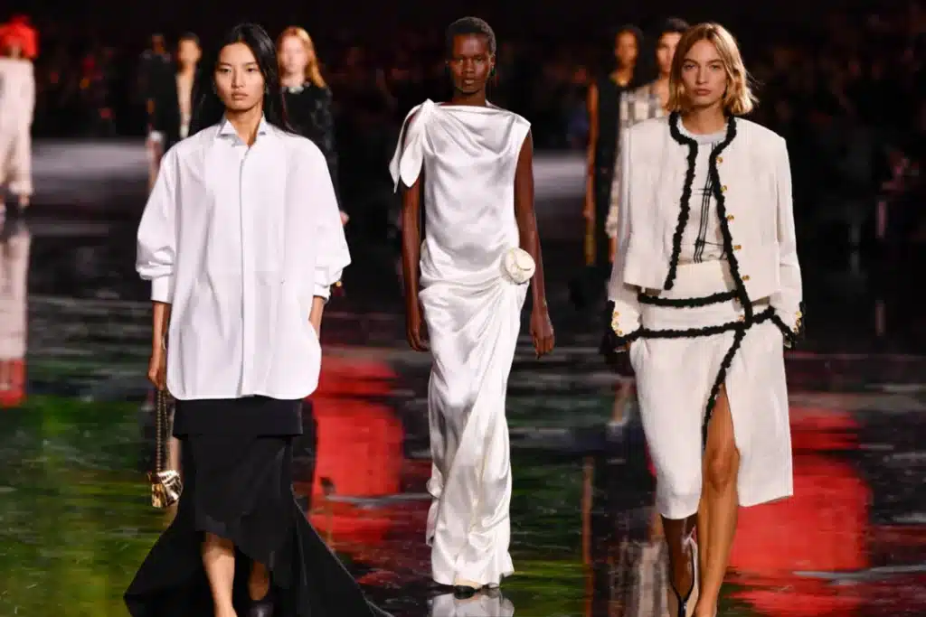 On the runway, Cloud Dancer pairs seamlessly with ink navy and metallic bronze. This combination signals quiet luxury without leaning into overt opulence. Tailoring feels modern. Accessories feel considered.