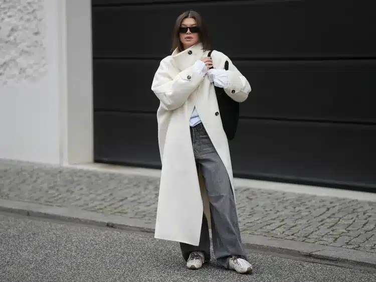 Tokyo street style offers a sharper contrast. Cloud Dancer paired with electric cobalt, chrome accents, and tech-driven materials becomes futuristic rather than fragile. The calmness of the base shade allows high-voltage color to exist without overwhelming the eye.