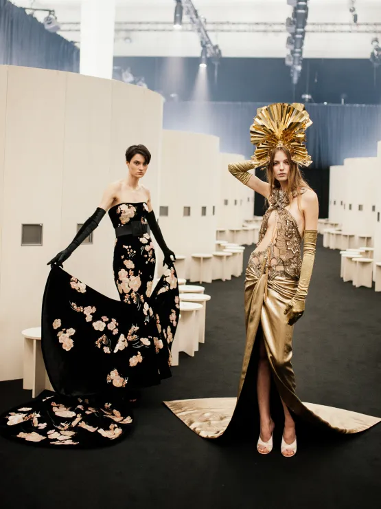 Staged within peephole viewing boxes inspired by the Kaiserpanorama, the show transformed spectators into voyeurs of cinematic illusion. Silent-film glamour, Art Deco fantasy, and Hollywood mythology converged in Erté-like silhouettes, feathered headdresses, and gilded goddess gowns. Set to classical and techno rhythms, the collection elevated fashion as a mirror of collective dreams, inviting contemplation, reverie, and transcendence.