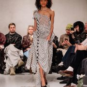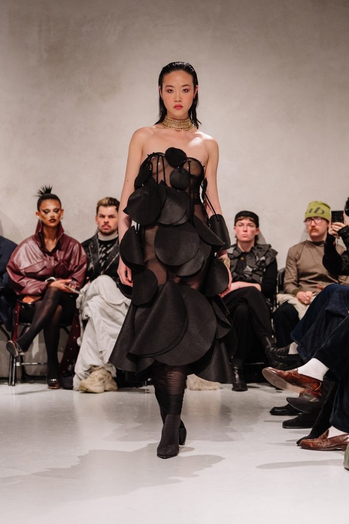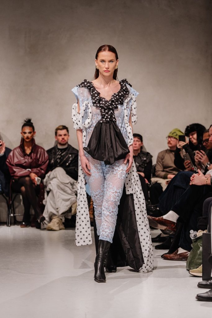 POET LAB delivered a controlled meditation on modern womanhood this season, exploring femininity through a lens that felt both introspective and assertive. Polka dots emerged as the defining motif, scattered across sheer layers and sculpted silhouettes that shaped the body with intention. Nets and translucent fabrics revealed flashes of skin, while sharp leather constructions introduced structure and authority. The interplay between softness and strength created a dark, considered mood that felt quietly powerful rather than overtly theatrical.