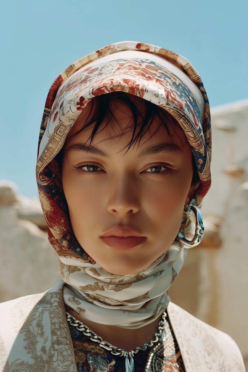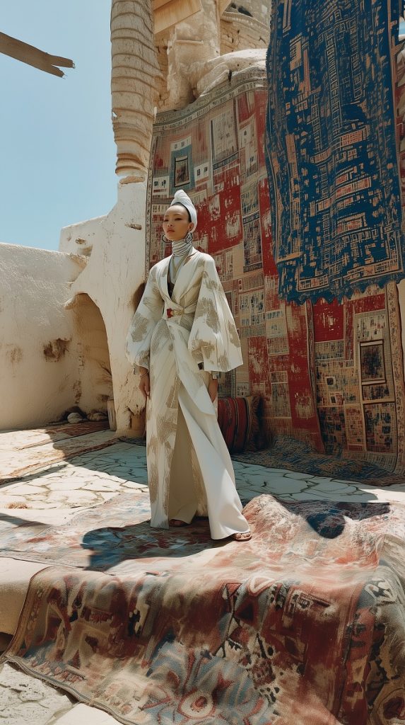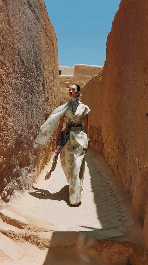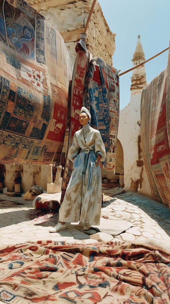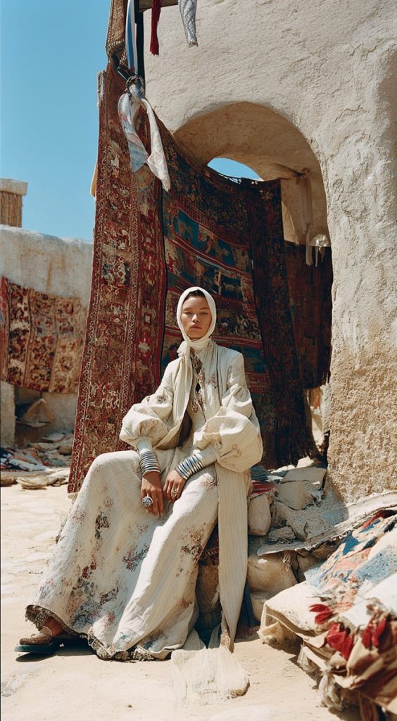 The sky sits clear and unapologetic, the kind of blue that makes everything else look like it has been telling the truth all along. A woman moves through sun and shadow as if she knows the shortcuts. Not the tourist kind. The private kind. Textiles hang like soft walls, like memory made practical. Patterns swing gently, then settle. The air carries dust, heat, and that quiet insistence that comes from old places built to outlast urgency. Her clothes stay light, almost ceremonial in their ease. Cream, sand, faded indigo, a trace of rust. Silver at the wrist, a ring that catches the sun once, then disappears again. She does not pose for the camera. She holds still the way you hold still when you’re listening.