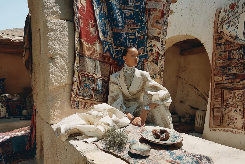 There’s a philosophy in how she wears softness. Not softness as weakness, but softness as control. She understands that calm can be engineered. Wrap the scarf. Tie the belt. Choose the sleeve that opens when you move, not when you stand. She looks at the courtyard the way someone looks at a question they have lived with for years. The textiles feel like pages, the stone feels like punctuation, and the shadows make their own rules. Somewhere nearby, a small plate of dates waits like a simple offering to the day. Nothing gets explained. Nothing needs a caption to justify itself. The story stays pure in another sense. It clears the noise and leaves you with one clean thought: maybe the most powerful kind of presence is the one that refuses to hurry.