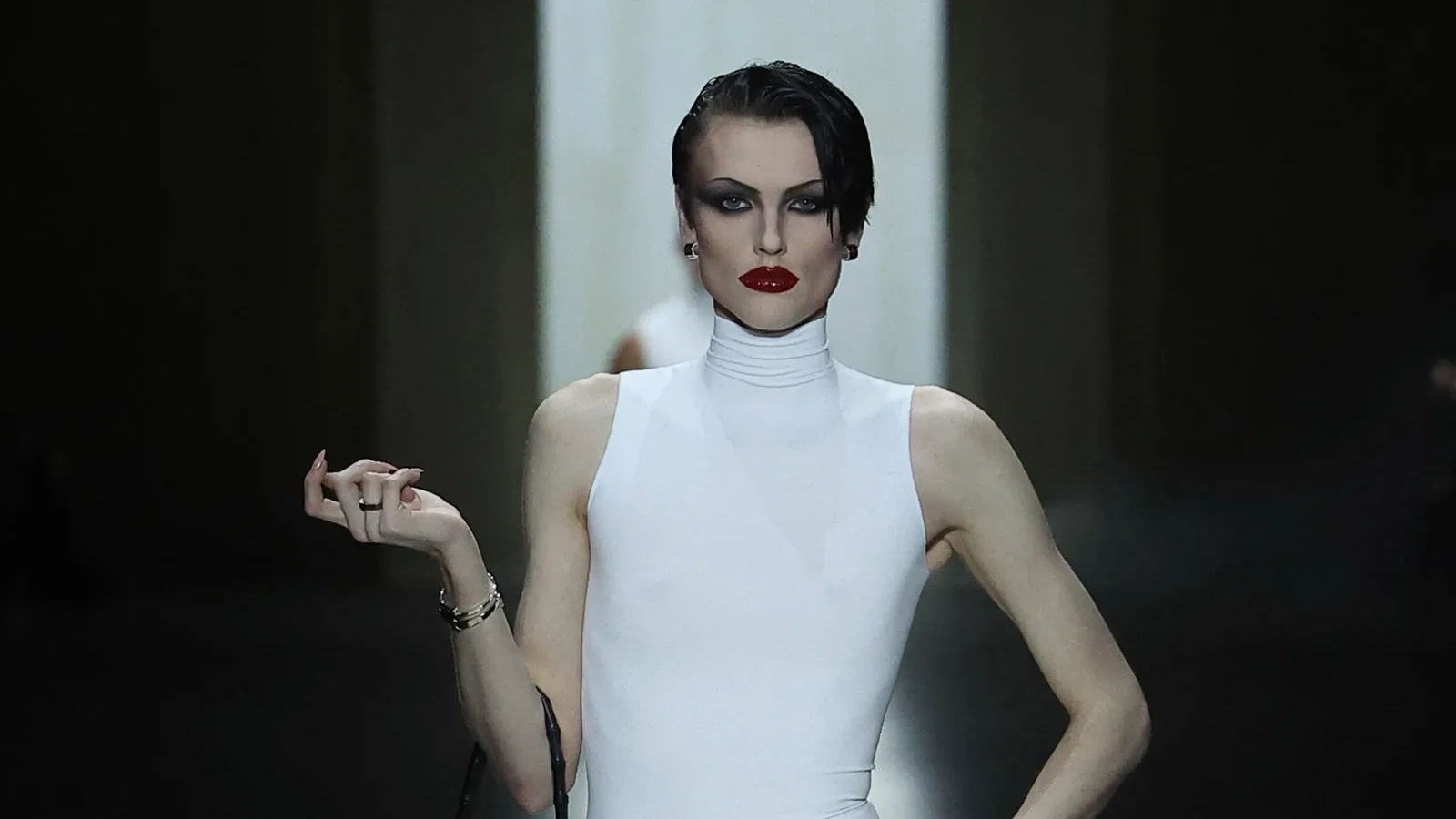 At Gucci, Demna restored equilibrium through control. Inside the monumental Palazzo delle Scintille, framed by classical statuary, he positioned the house within cultural continuity rather than seasonal volatility. Primavera proposed renewal through discipline: a second-skin white minidress reduced fashion to construction; heat-sealed seams and sculpted tailoring recalibrated sensuality into precision. Even the 1990s reference, a GG thong worn by Kate Moss, was filtered through restraint. Gucci did not rupture; it consolidated.