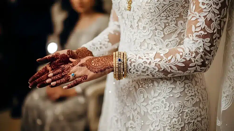 Image Source : https://www.dreamstime.com/close-up-bride-s-hands-adorned-intricate-henna-designs-stacked-gold-bangles-bride-henna-hands-gold-image429907652